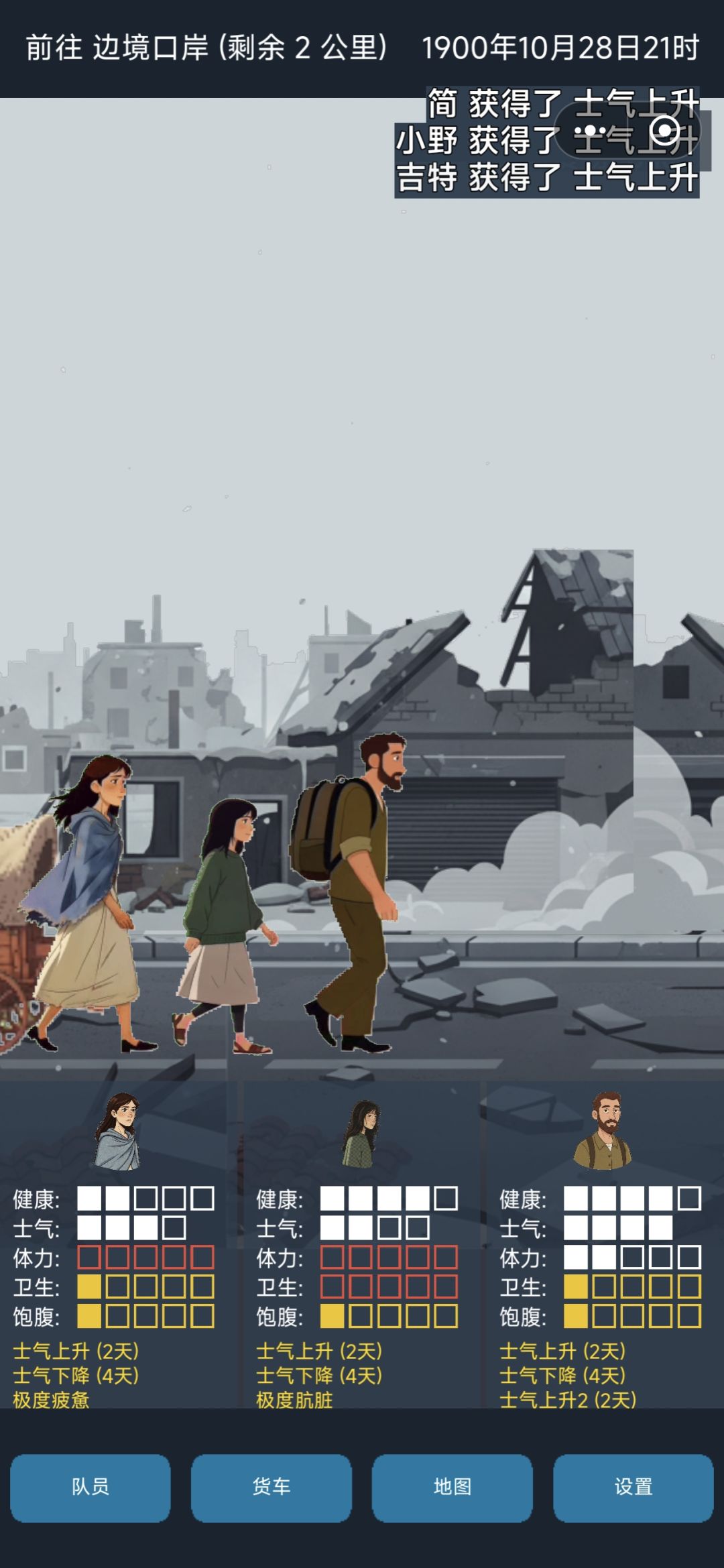 。渡河失败卫生体力都降到冰点,然后就是图3-4,食物也没了硬抗到了边境,全体在死亡边缘幸好活了下来。第一次玩全员生存通过