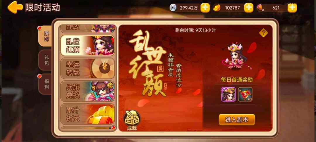 活动内容:活动期间开放“乱世红颜”限时副本,每日首通获得奖励。