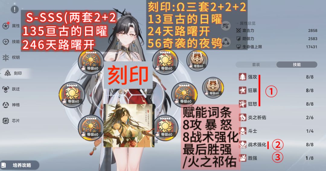 - 词条(辅助1+2专):8强攻8狂怒8狂暴→8战术强化→余下胜强/火之祁佑