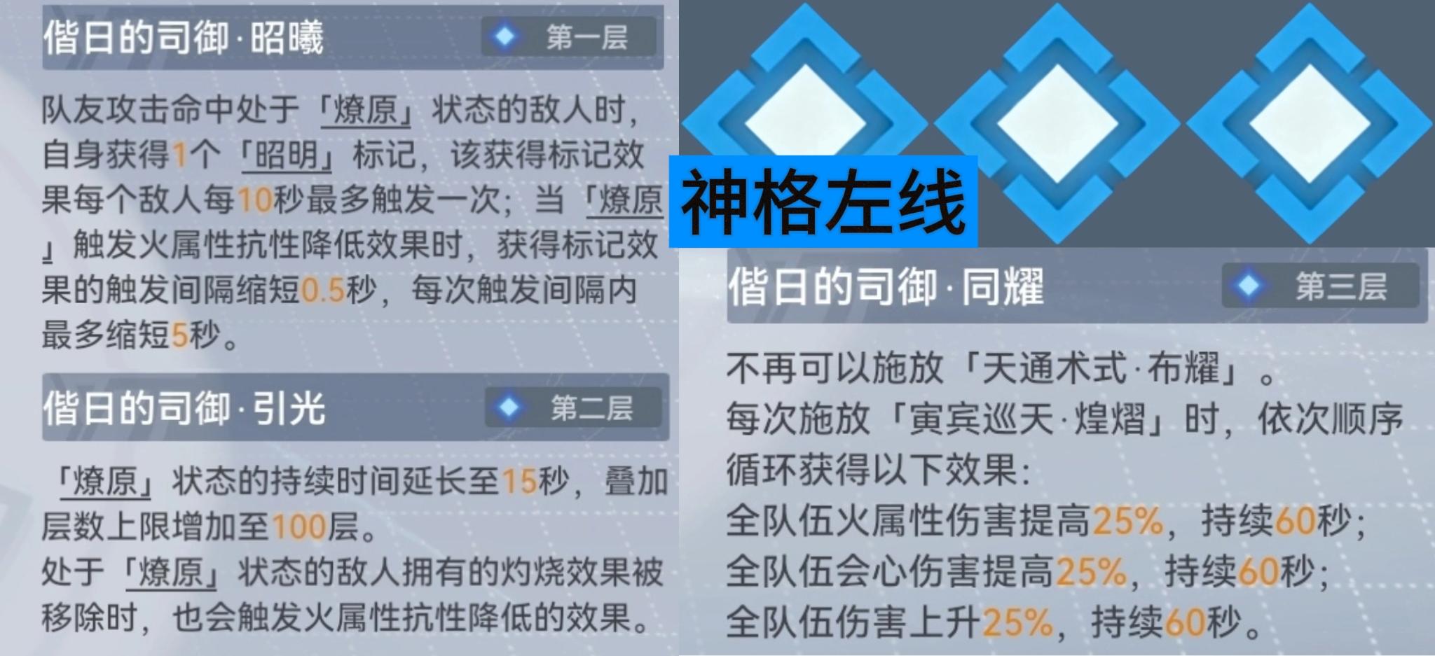 - 神格左线辅助不用。左线去掉强普(获取标记),专注衍生一的燎原状态用来队友给标记, 至于上buff,放3次衍生3才全,很慢,还要注意阵时长。金乌队实在没人就ai位吧(不推荐)