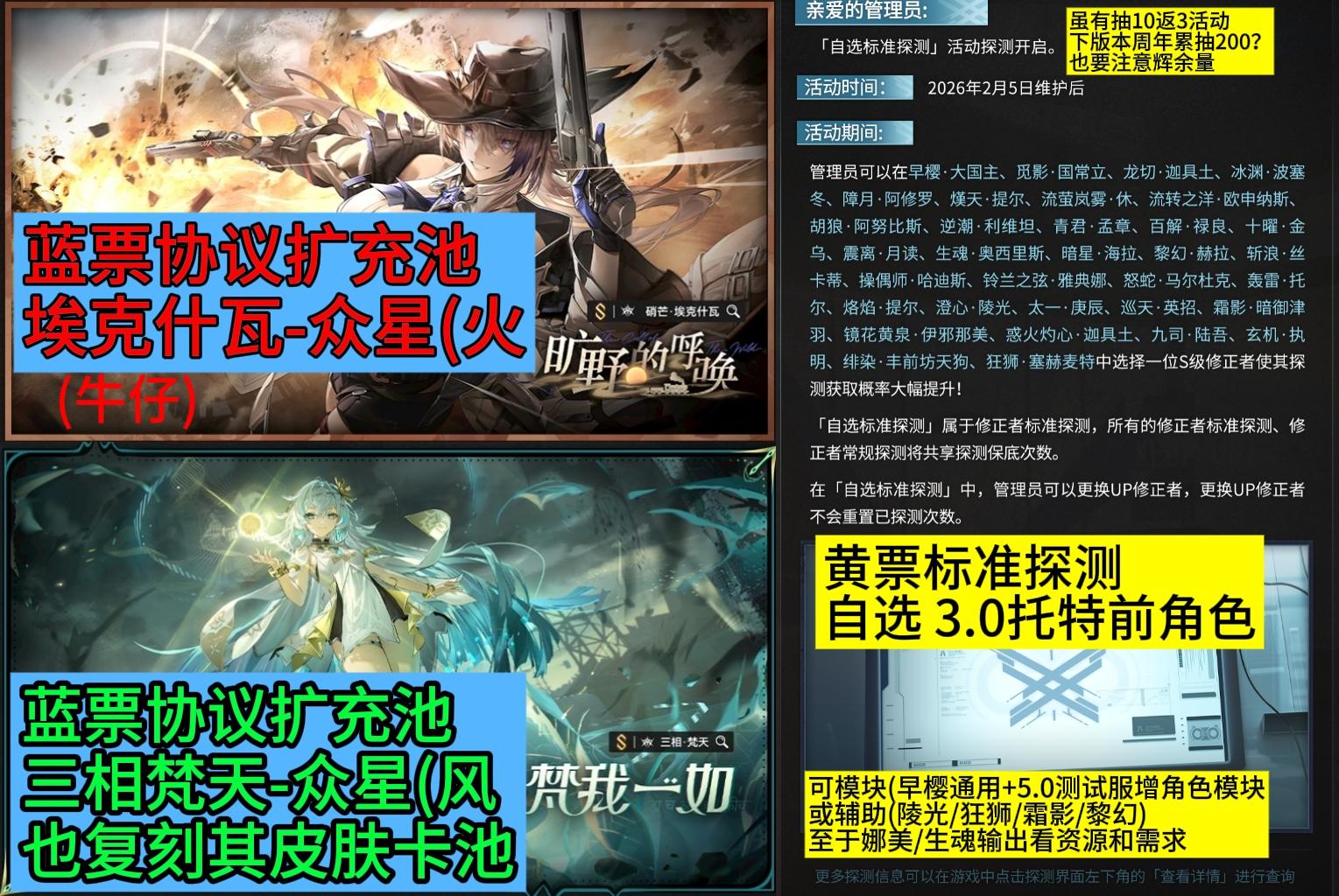 - ⏸常驻:自选黄票up,临近四周年5.0版本,辉低于2万不建议抽取(周年累抽200?)目前黄票可选模块(通用早樱或看5.0测试服新增模块?)或辅助(如陵光火/霜影冰/狂狮物理/黎幻通用等)。虽有黄票折扣活动, 也要注意辉量).