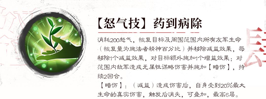 依旧是回复范围内所有友军的生命及移除减益效果,不同的是,怒气技能可将减益效果”反转“成增益效果,即每移除1个减益效果后,将添加1个增益效果;再对范围内的敌军造成无属性谋略伤害,并施加【暗伤】减益效果。