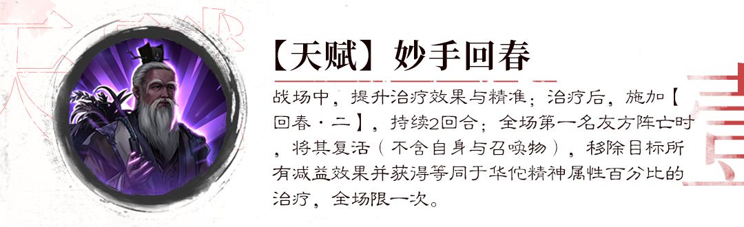 华佗的技能机制深度贴合“神医”设定,在战斗中,其技能的治疗效果以百分比指数提升,并且对治疗目标施加【回春·二】增益效果,持续2回合。并且还能够自动复活队伍中阵亡的第一名友方单位(不包含召唤物),回复华佗精神属性百分比的生命值并移除所有减益BUFF效果。