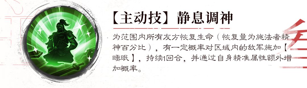 兼顾续航与控场的全能技能!可恢复范围内所有友军生命,大范围群体回血。之后更有控场惊喜——对范围内的所有敌军有一定概率的施加【睡眠】效果,持续1回合。更关键的是,会自身拥有的【精准】属性,提升【睡眠】概率。【睡眠】效果为强力控制,中招敌军将失去全部操作能力,且无法反击,受到一次伤害后效果后才能清除。如没有受到伤害,则会一直持续被控。