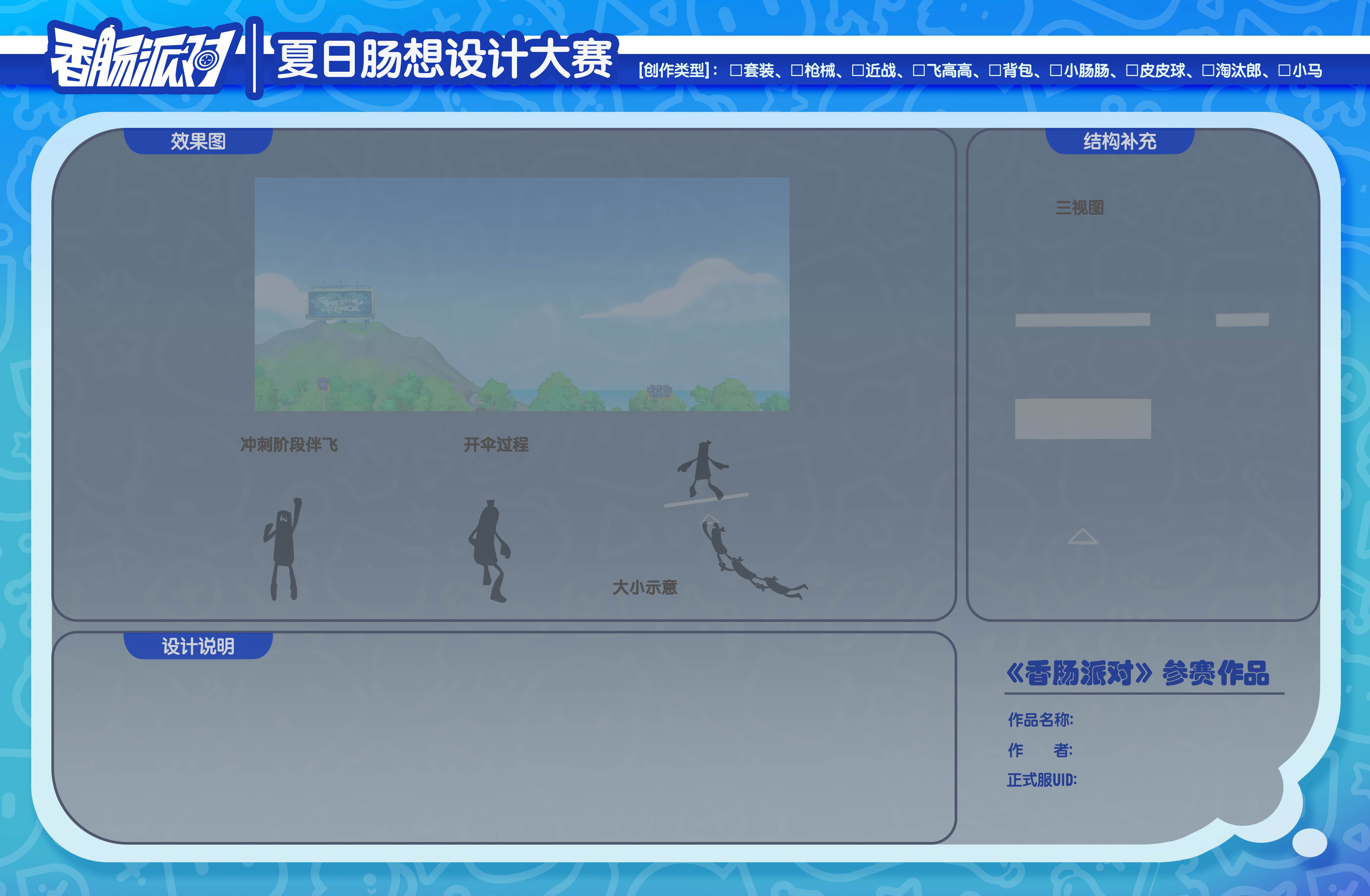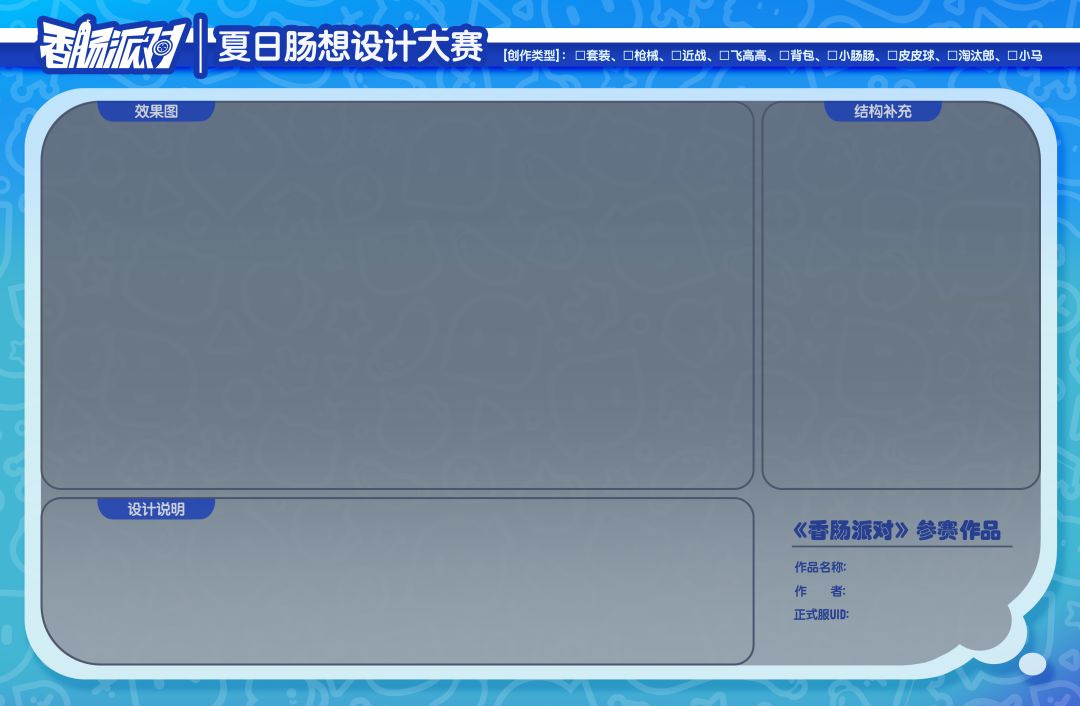 6、肠肠在提交作品时,需要提供作品的主视效果图,可以添加作品细节进行展示,也可以适当补充套装、武器、玩具等效果说明。(具体信息请参考下方创作模板及参考例子)