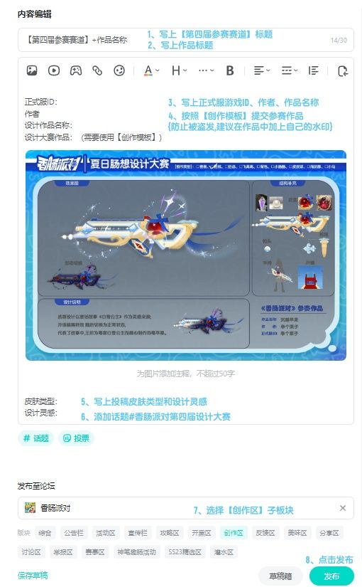2、 作品应按照上方示意图中的示例来发布,并需要使用【创作模板】。请将您的作品上传到TapTap《香肠派对》论坛中的【创作区】中,在发布作品时添加话题#香肠派对第四届设计大赛 标题中须注明参赛赛道,例如:【第四届套装赛道】、【第四届武器赛道】或【第四届玩具赛道】,并写明【设计作品】的名称
