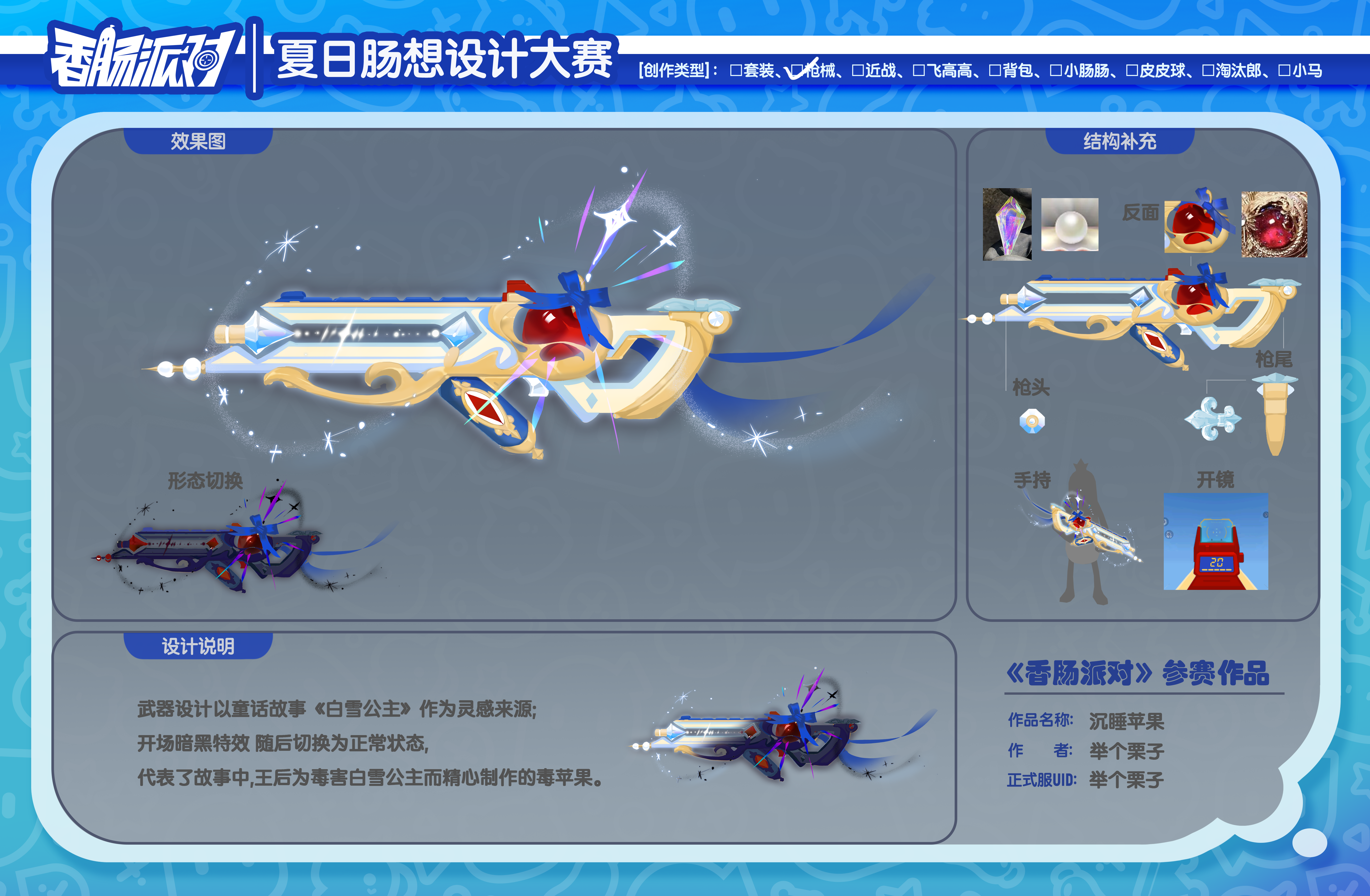 【设计灵感】:武器设计以童话故事《白雪公主》作为灵感来源;开场暗黑特效,随后切换为正常状态,代表了故事中,王后为毒害白雪公主而精心制作的毒苹果。