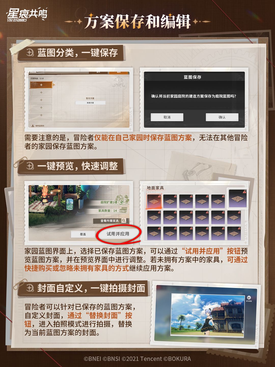 冒险者可以通过保存当前家园装扮,不错过任何一个一闪而过的灵感!还可通过蓝图码,与好友相互分享彼此的家园蓝图,在不同风格的主题家园之间快速切换,你的家园任你变换!