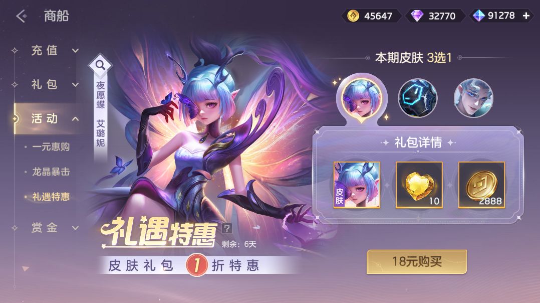 礼遇皮肤礼包限时1折,望舒·惊鸿素练、貂蝉·深眠魔女、鳗鳗·玩具大亨超值3选1获得。