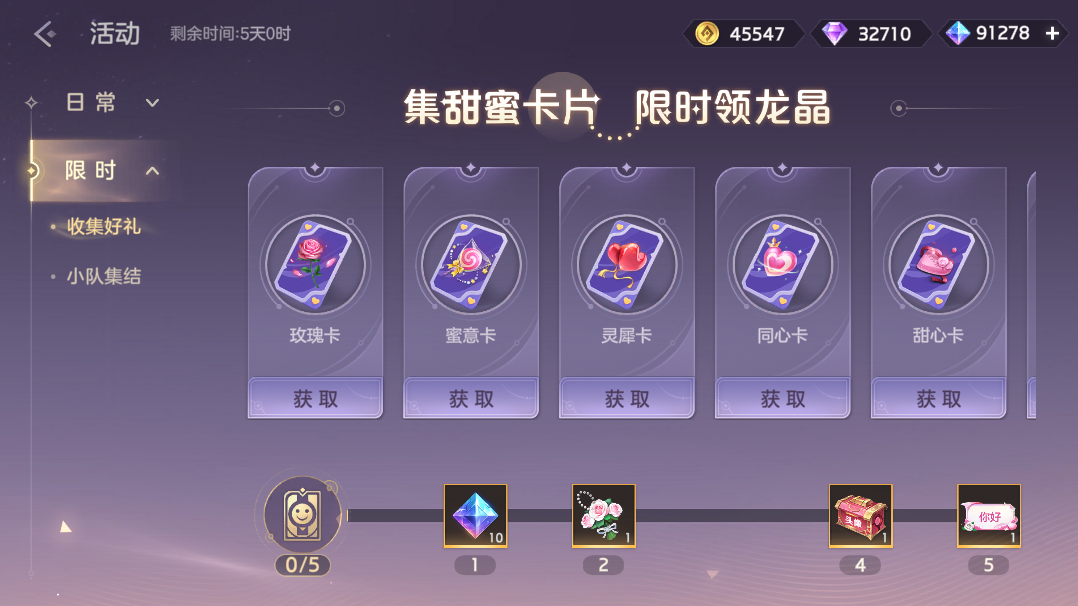 购买甜蜜礼包收集甜蜜卡片,根据收集进度可获得新款限定聊天框纸短情长、新款限定挂件花漾情浓、情侣头像自选箱、龙晶*10。