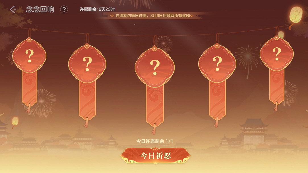 每日放飞天灯领取随机奖励,累计放飞5次解锁自选礼包,皮肤6折龙晶折扣券、10级绘卷经验包、礼券等奖励等。