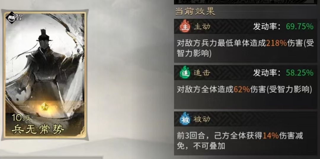 被动技能固定携带【兵无常势】,为全体提供伤害减免,有效抵御敌方快攻,避免前排过早被击破、核心输出遭受威胁,从而保障队伍能稳定过渡到2回合后的强势期。