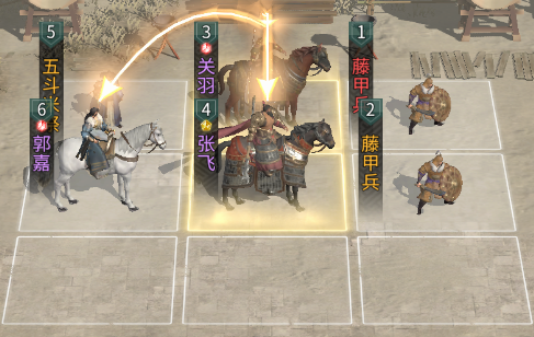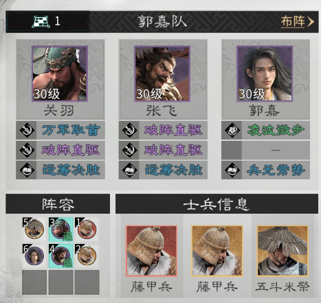 兵种站位:在关羽和张飞的前方各放置一个藤甲兵,在郭嘉的上方放置一名五斗米祭。