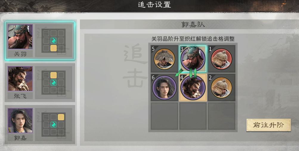 英雄站位:郭嘉不站追击格,关羽站郭嘉的追击格,并与张飞互站追击格。