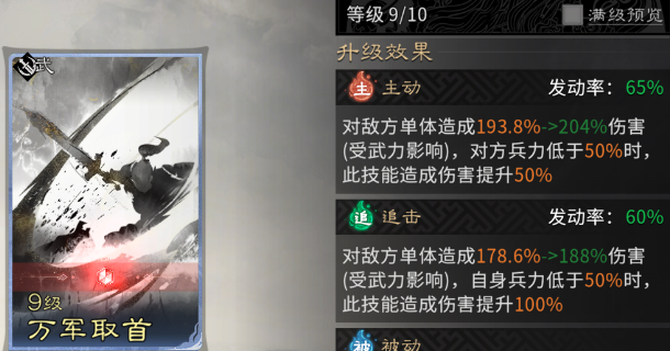 关羽的主动技能固定携带【万军取首】,该技能倍率优秀,对低兵力单位有增伤效果,且发动概率较高。配合关羽天赋【青龙偃月】赋予的【畏】(易伤)状态,可打出极为可观的爆发伤害。