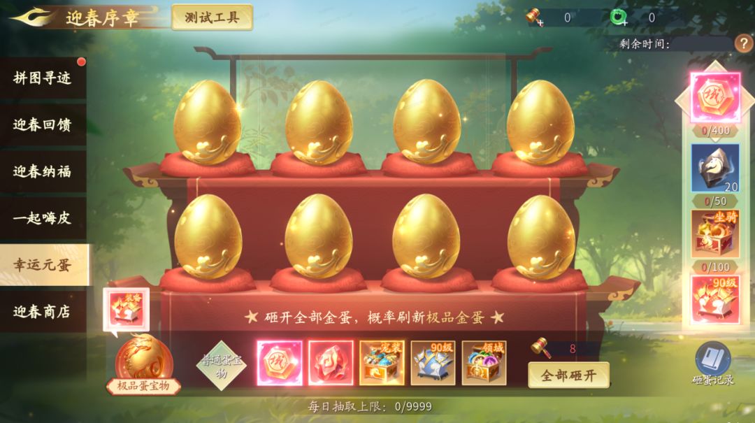 小锤砸金蛋,好礼破壳出!使用小锤砸开金蛋可获得奖励,所有金蛋砸开后将刷新新的金蛋,还有概率刷出极品金蛋,刷出极品金蛋时可手动刷新金蛋哦~累计消耗锤子达指定数量还可以领取额外好礼!