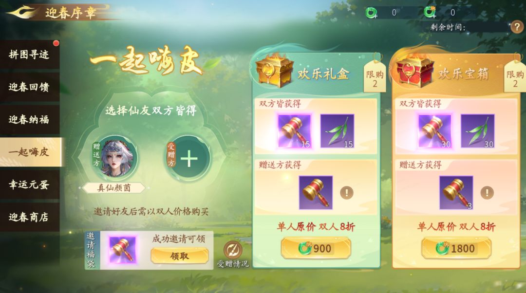 如此春意,怎忍独享?快叫上你的小伙伴一起嗨皮吧!仙友们可原价购买礼盒,也可邀请仙友享受双人8折优惠价,为自己和仙友各购买一份礼包!每种礼包都限购两次也仅可受赠两次,赠送方将额外获得邀请礼和赠送礼~邀请需对方同意,成功邀请后只能进行双人购买。