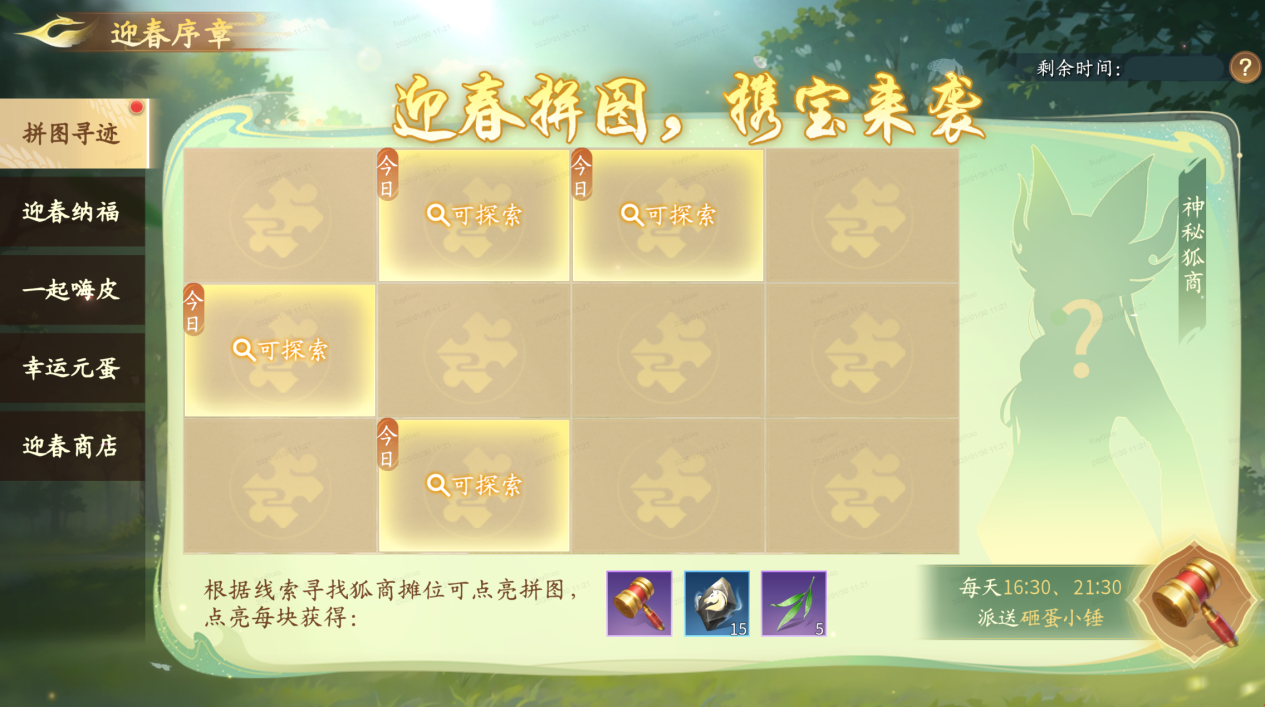 快来跟随小师弟一起遍寻春意吧!揭秘线索,探寻宝物!根据线索寻找狐商可点亮拼图获得奖励,每日指定时间还有限时宝箱出现在今日开启的神秘狐商附近,根据提示前往寻找,先到先得!