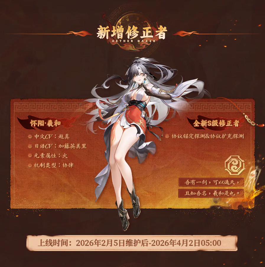 - 怀阳·羲和 需要抽取 新时代主C型火系角色 输出能力不弱 单S就能当C 配队灵活 不刚需连携 配合两个火系通辅即可轻松过关迭代8 是新玩家非常棒的选择 相对的与金乌连携 但是因为实际效果并不理想 需要观望