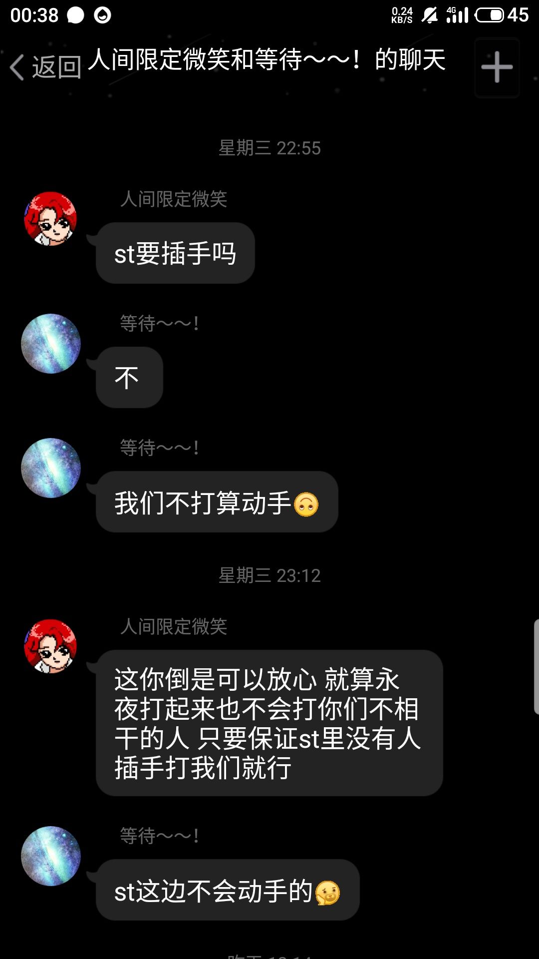 首先,当得知周六盛世必打永夜后,我便与堕进行了交涉,明确表示了我们不会参与此事,此时堕的回复是不会波及他人(附聊天记录摘录图)