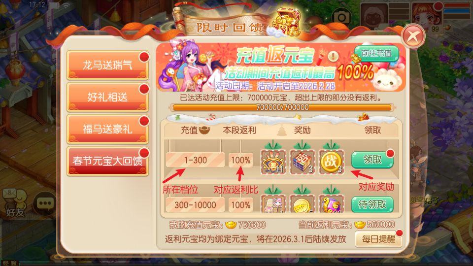 2026年2月1日-2月28日为元宝充值阶段,在活动期间内充值元宝达到指定数额,即可获得相应档位的道具奖励,并且在活动结束后,还会获得分段元宝返利,最高可返利100%。