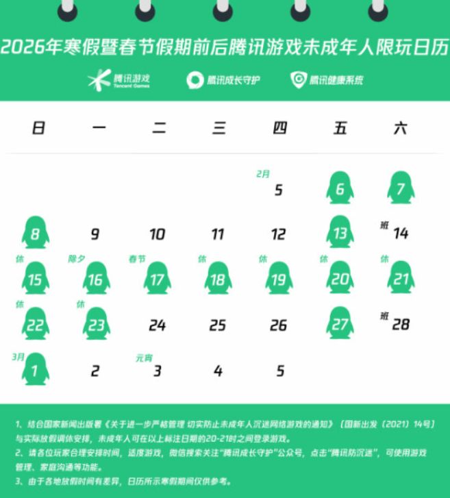 今日,腾讯游戏正式发布2026年寒假暨春节假期前后未成年人游戏限玩通知,明确2月5日至3月5日期间的游戏登录规则。未成年玩家仅可在可玩日期的20时至21时登录游戏,整个寒假29天内,累计游戏时长最多为15小时,严格落实未成年人防沉迷相关要求。
