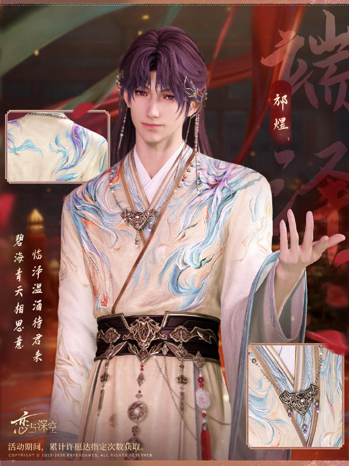 累计活动许愿达200次时,可在「沈星回·问剑观花」、「黎深·飞鸢坠春」、「祁煜·锦夜琢心」、「秦彻·千灯共我」、「夏以昼·晴昼当归」中自选一张获取。