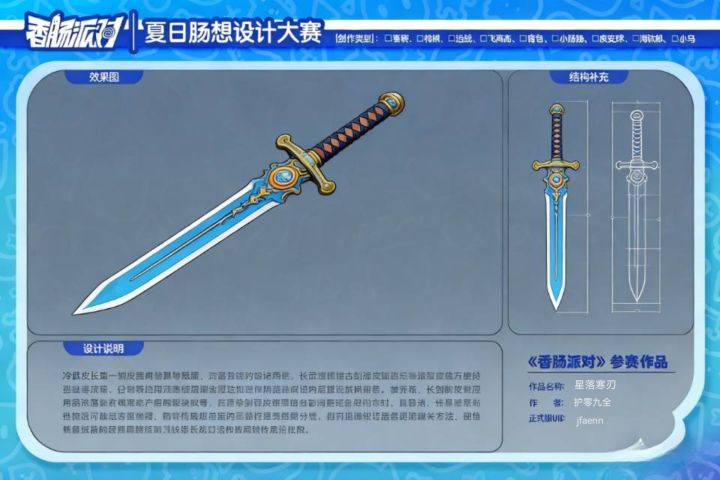 【设计灵感】:以“星际陨铁淬炼神兵”为核心灵感,剑身流转幽蓝星芒,挥动时洒落细碎光粒特效。常态下剑鞘呈哑光墨色,刻有北斗七星纹样;激活后剑鞘开裂,露出内里泛着寒光的陨铁剑身,末端镶嵌的蓝宝石随攻击节奏闪烁,仿佛捕捉了坠落星辰的力量,兼具神秘质感与视觉冲击力。
