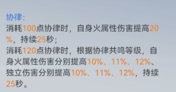 协律效果:未携带管理员芯片 奥义/连携会消耗全部协律值 自身火伤提高 如果携带管理员芯片 管理员技能才能消耗全部协律 自身火伤/独立提高 该增益会随着释放次数/协律角色数量增加 最多三层