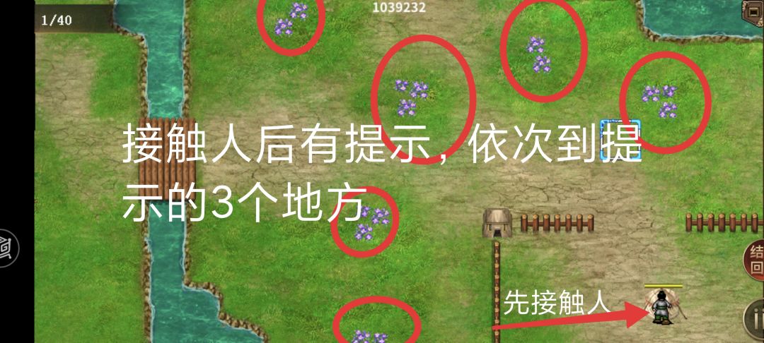 3 右下方,先跟人接触,会有提示,然后依次到提示的3个地方,每到一处,下一回合有一个怪出来,打死再到下一个地方,依次3个地方一轮,然后再跟人接触得钱,然后出来一个怪竹叶青,打死得豆;
