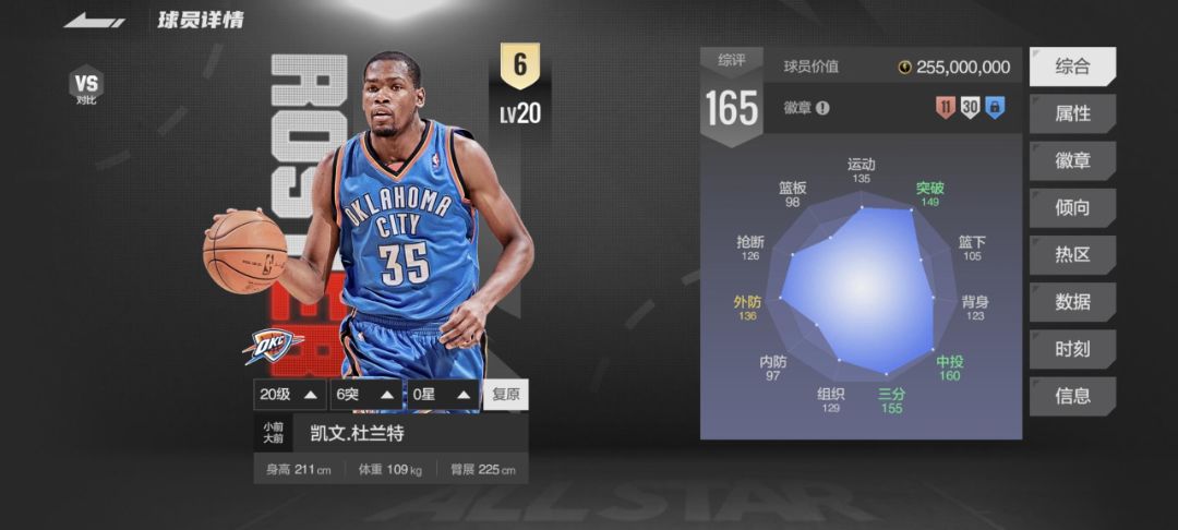 此外杜兰特也能胜任1号位,145的控球属性,搭配135的双速,加上银运球好手、护球大师、光速引擎等组织徽章,让你在游戏中感受雷霆杜无解单打的威力