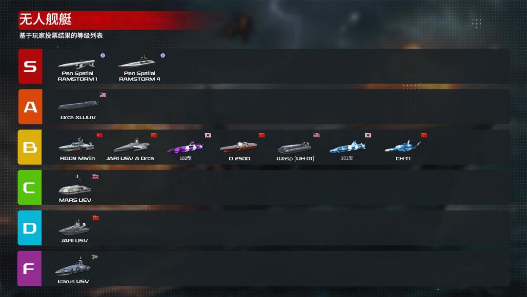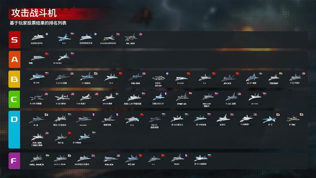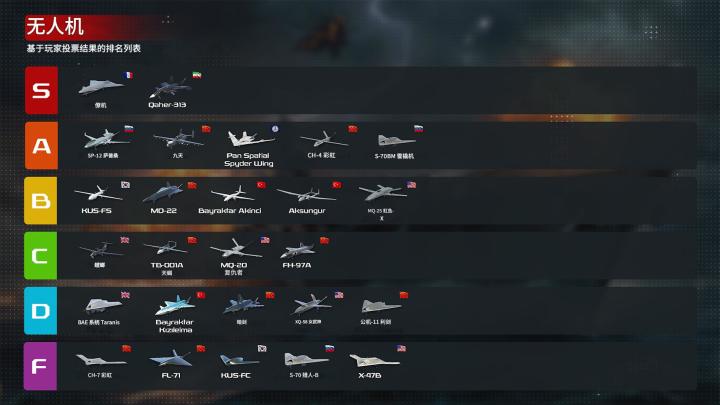 基于相同原因,尽管B-21"突袭者"与图-22M3M"逆火"-C本次评级急剧下滑,我们认为其评分下降问题可能在后续调查中得以改善。战斗攻击机超级军旗、[印度斯坦航空]AMCA、米格-1.44"扁包"及[泛空间]菱蝠的评级同样有所下降,因为玩家明显更倾向于选择当前更为普及的具备垂直起降功能的替代机型(是谁呢,好难猜啊)。两款全新泛空间无人舰艇作为游戏生态变革者,已对现有无人载具整体施加了“祛魅效应”,其中JARI-USV的评级受影响最为显著。