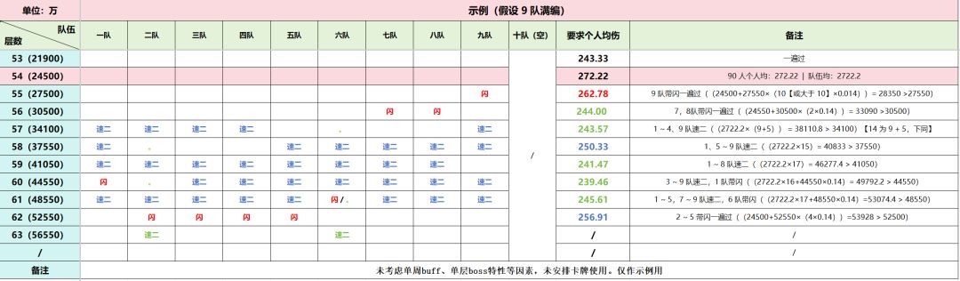 上图其实已经是一个相对成熟的预排表了,只是执行起来可能比较有难度。从个人要求均伤其实可以很容易发现,假设54层可以正常通过的话,后续的层数其实已经留了相当大的伤害容错。需要通过62层的话,21/22次也是一个比较合理的次数,时间上压力也不会很大。