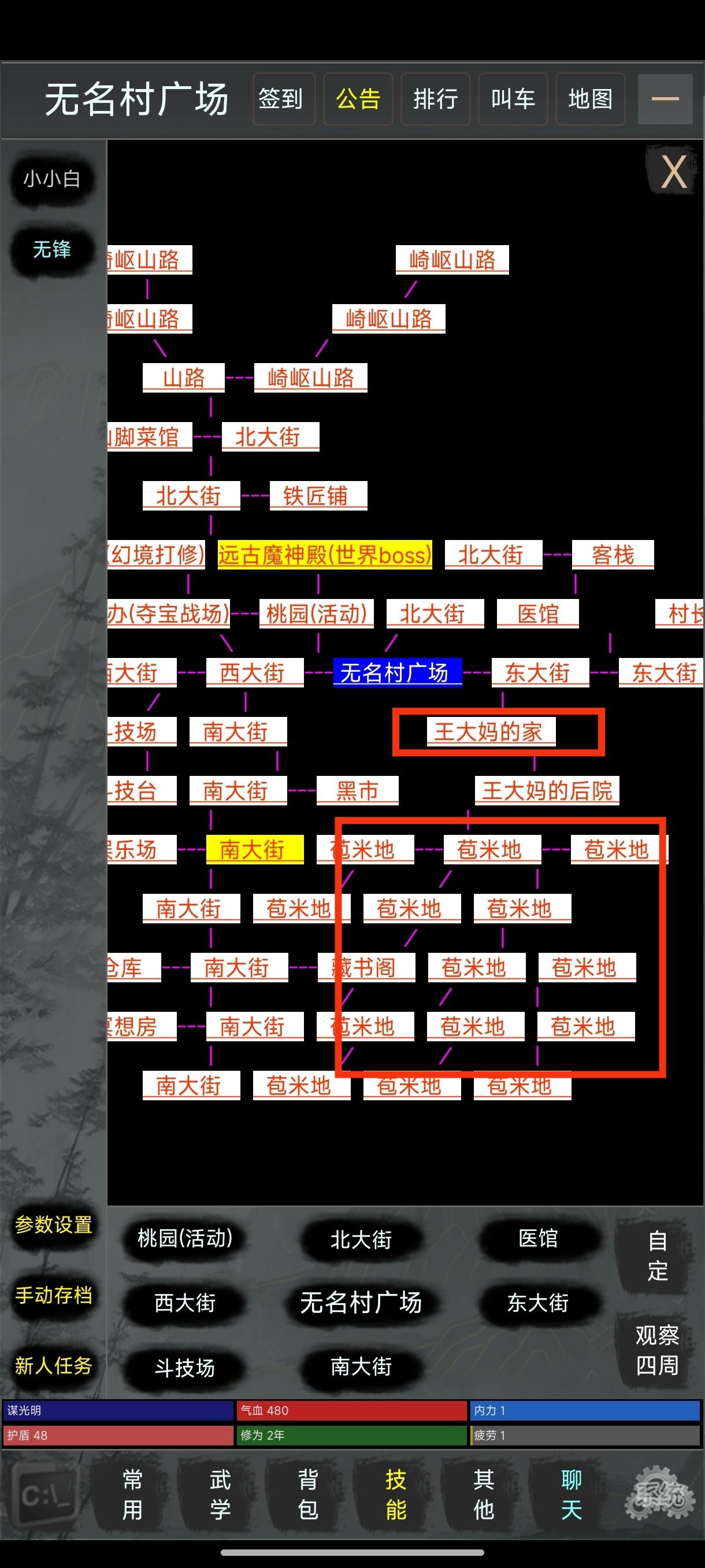 立刻前往广场右侧王大妈家打鸡儆白仙,可获取冲脉必备的修为和1-3级基础书、1-3级特书、1-3级装备材料。
