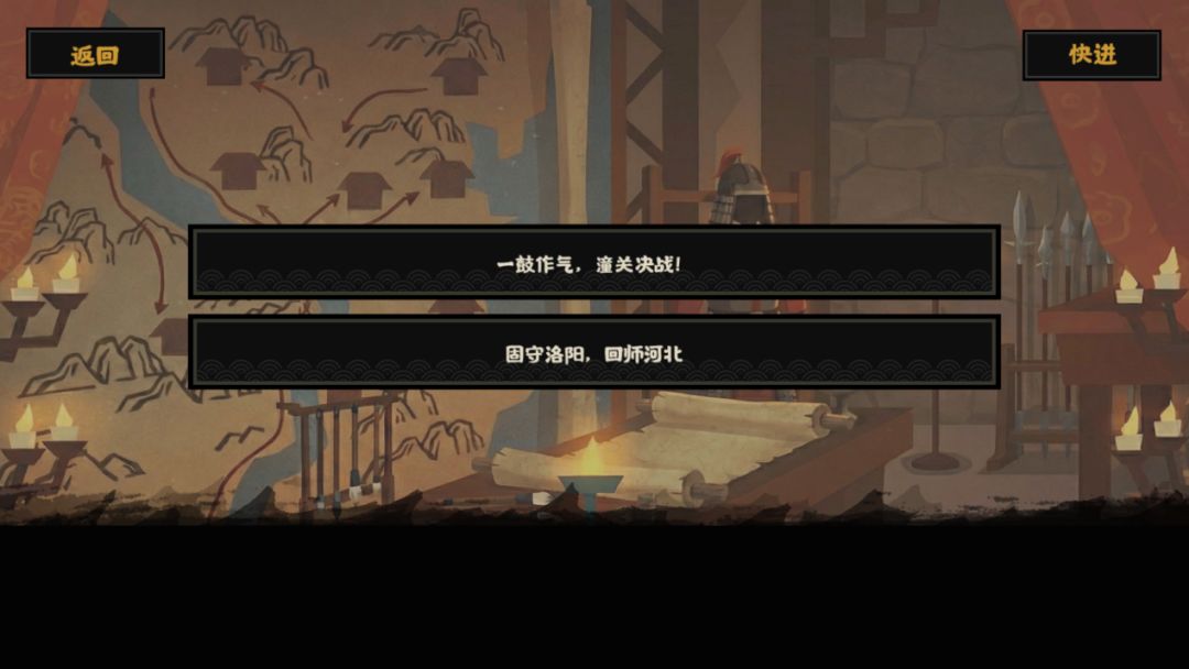 选择【一鼓作气,潼关决战!】则会触发潼关之战,战斗胜利后,触发事件【讨伐伪唐】,并解锁使命任务【占领长安】;如若选择【固守洛阳,回师河北】,则可触发结局【天意昭昭】。