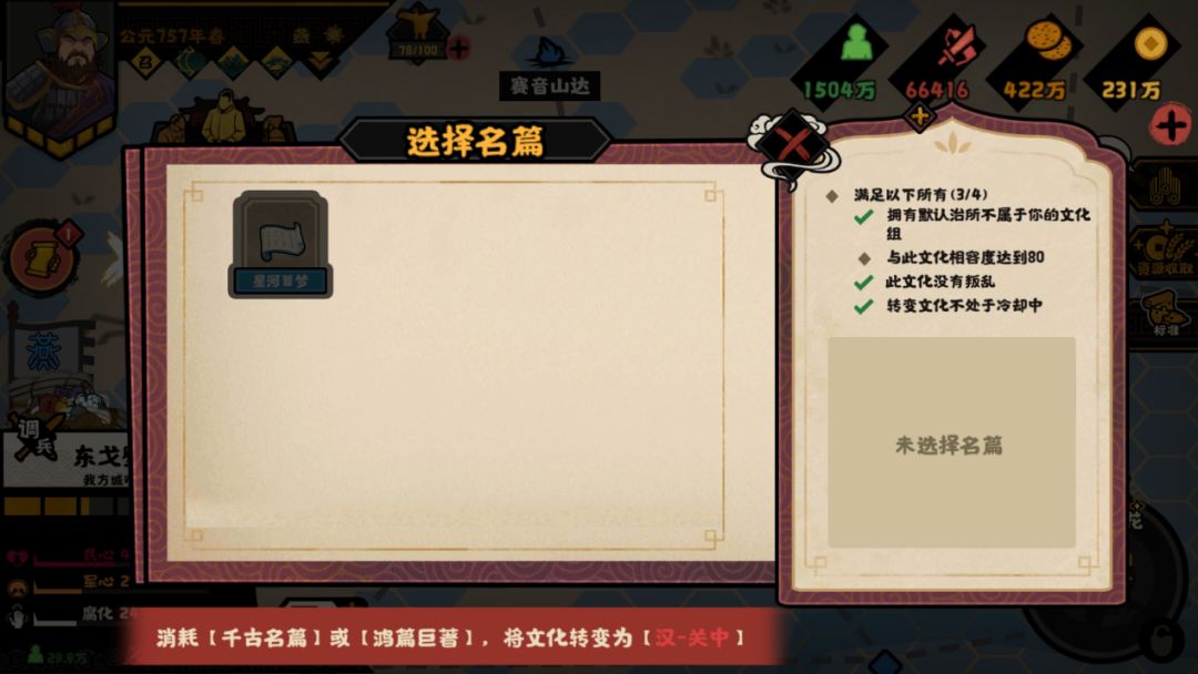 注:转变文化需要对应的治所满足一定的要求,并消耗一本【千古名篇】或【鸿篇巨著】,这里推荐先用名篇传播文化提高文化相容度,然后再转变文化。