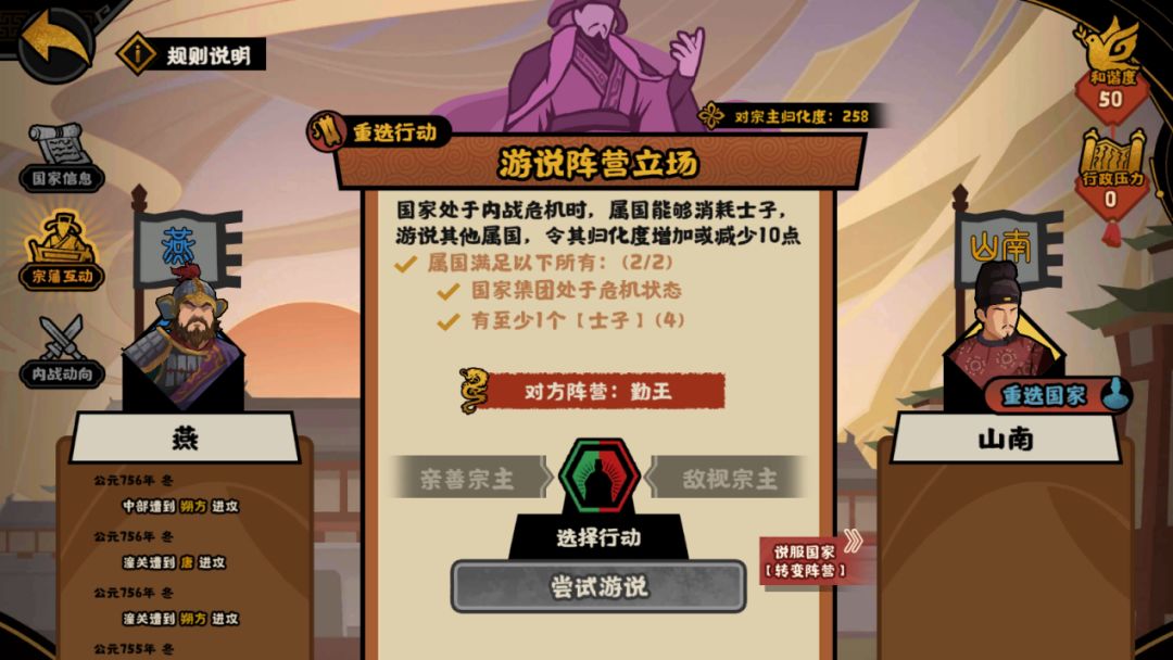 同时我们可以选择攻灭山南势力,完成【消灭叛军】剩余任务;也可以选择拉拢山南成为朝贡国,后续通过提升归化度将其吞并以完成任务。