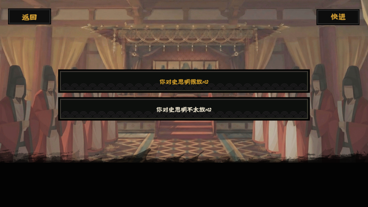 在剧情中选择【黄色字体】选项相信史思明,则不会触发后续反叛。如果选择【白色字体】选项不相信史思明,后续则会触发【史思明自立】,从而解锁使命任务【清除叛逆】