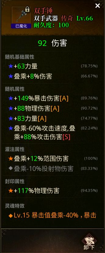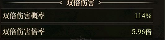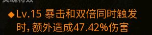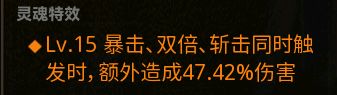 在后期,我们双倍概率达到166.66%以上时,我们还能用减双倍概率叠乘+双倍倍率的灵魂特效来大大加强我们的伤害,因为我们的双倍倍率是独立的乘区,在各种inc伤和more伤被稀释的情况下,这一条特效给我们带来的是伤害总增40%+,这个很强。。请坚持单独堆双倍倍率。。