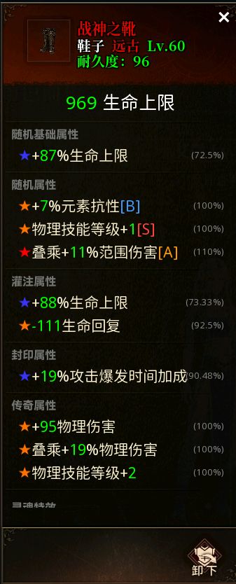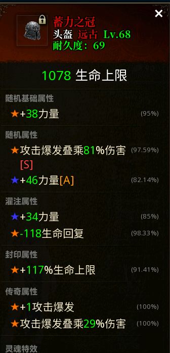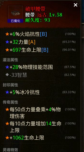 像我本身的腰带并不好,如果是60级以上的腰带,还可做辅助技能+2那些属性。同时我们遗物尽量在满足堆满抗性的前提下,尽量堆力量,力量>生命上限>元素抗性>其他