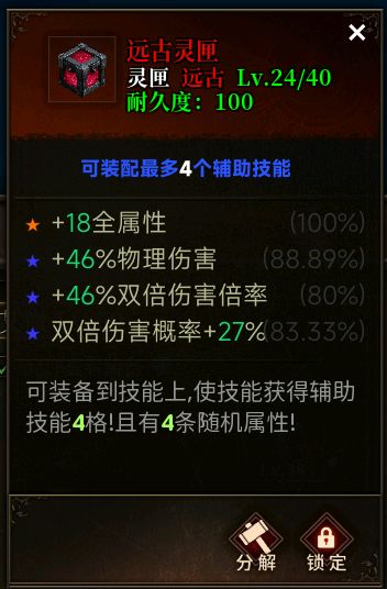 这是因为灵匣,对比遗物我们可以发现,灵匣上的主属性力量要差遗物很多,其他的属性,例如物理伤,范围伤那些inc伤,以及技能范围,都算是一些次要属性。所以我灵匣上主要弄的属性是:双倍概率=双倍倍率>点伤>其他inc伤及力量和范围。