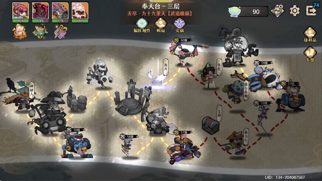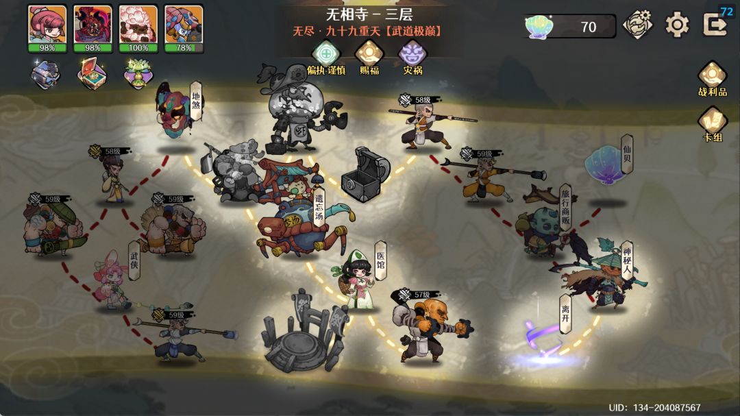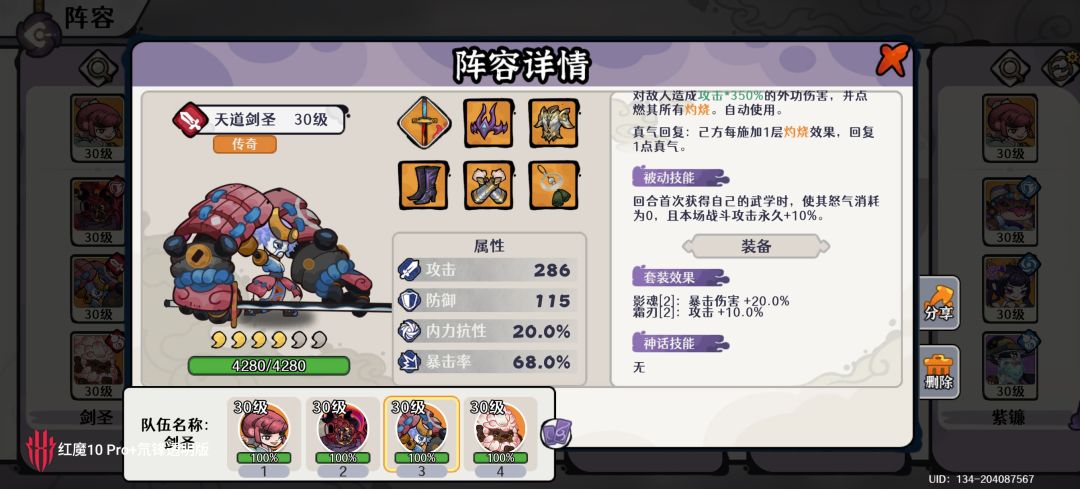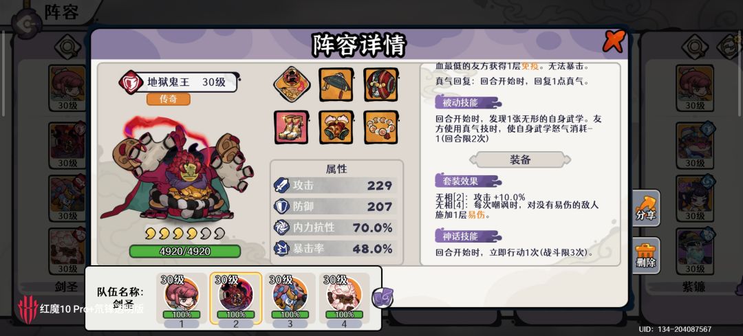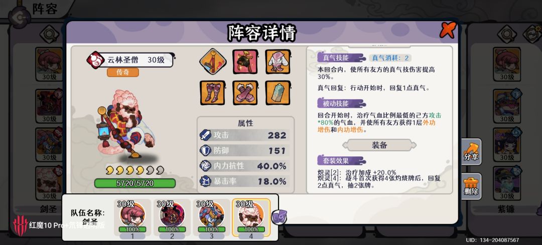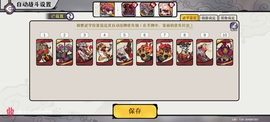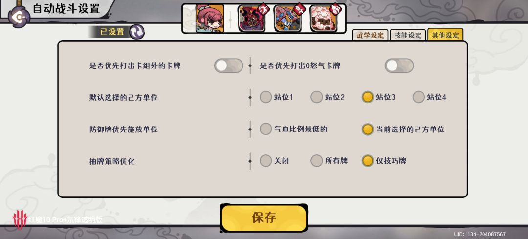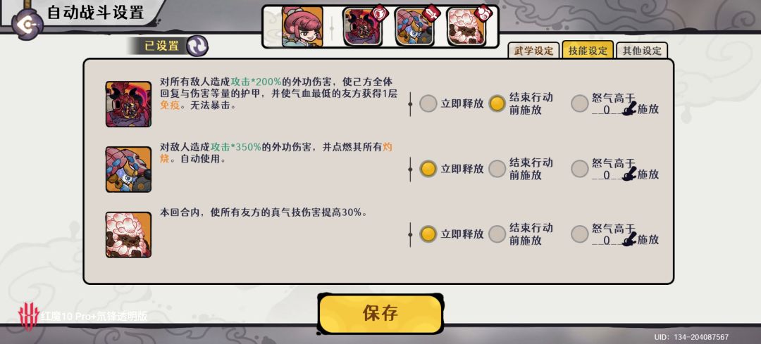 自动输出循环逻辑为 开局圣僧释放真气技能,第一、三回合鬼王同时触发步履星河+无相的装备特效,嘲讽敌方全体挂易伤。后续高频为敌方挂燃烧状态从而触发剑圣的真气技能。单回合剑圣真气技能触发频次越高,鬼王武学卡最后释放时伤害越高。