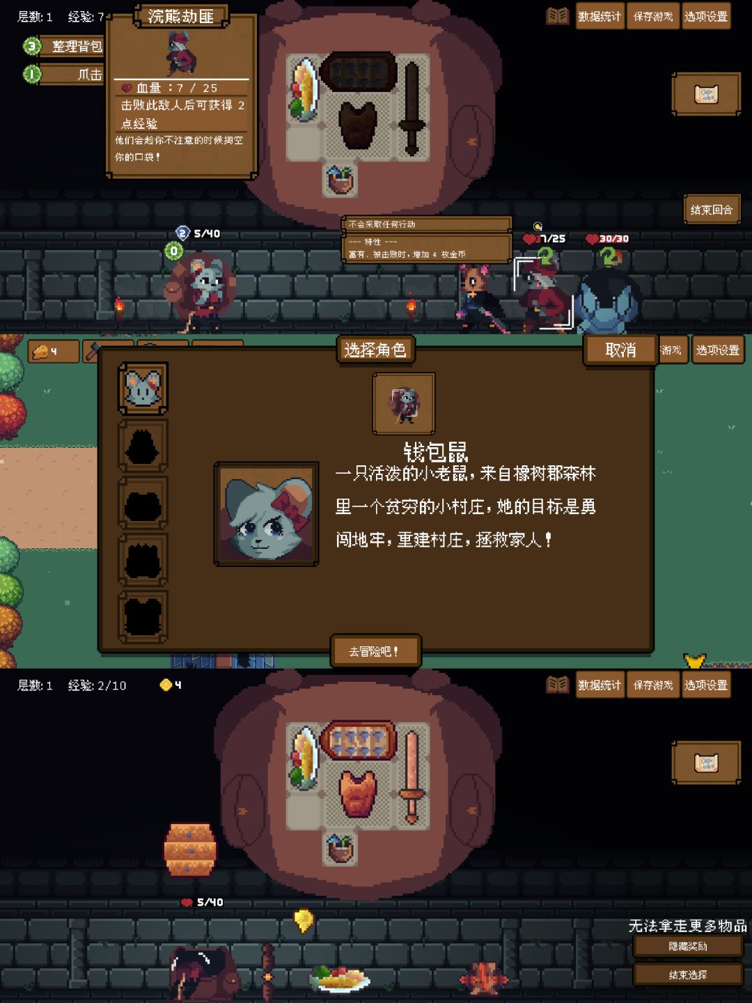 ·作为一只爱冒险的小老鼠,你的背包就是你的战斗力,装备和掉落物品怎么放和放什么全靠自己的筛选和摆布。