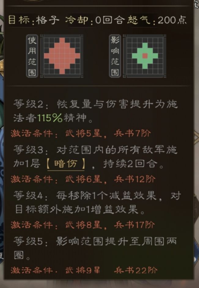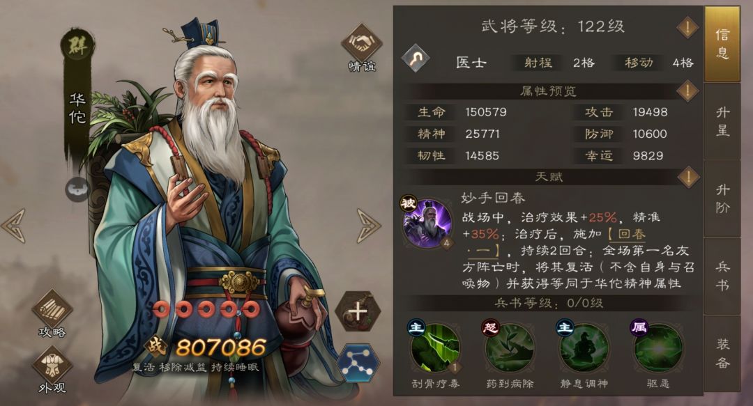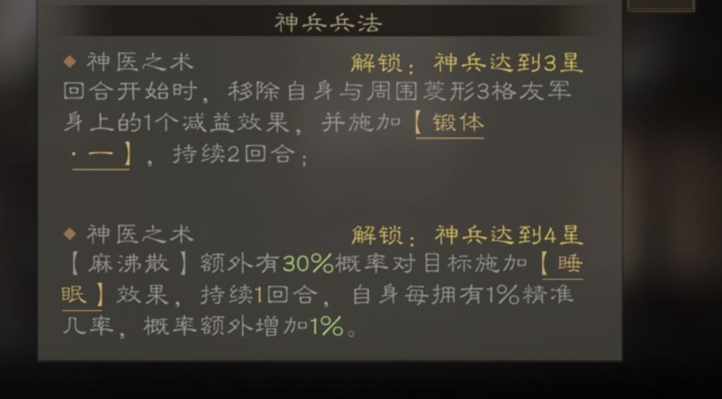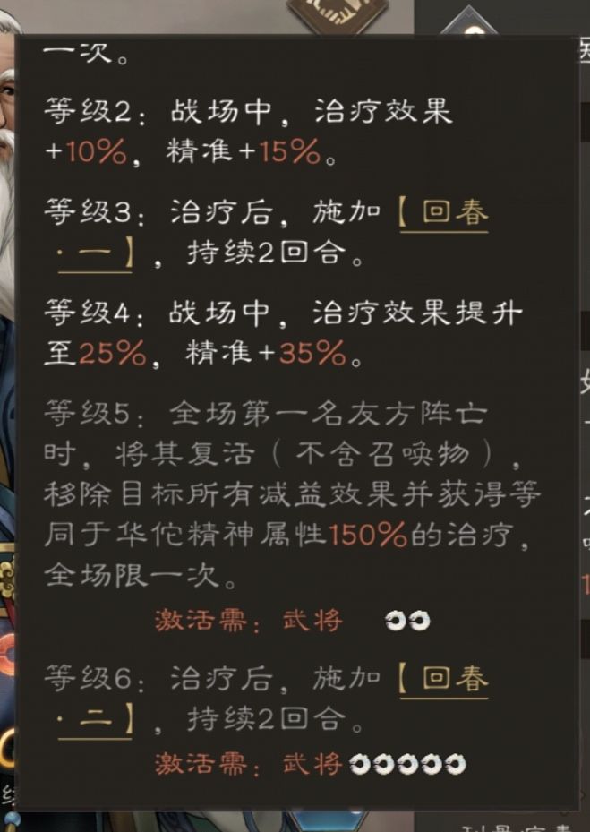 妙手回春:增益治疗 增加精准 施加回春 及复活首个死亡的武将(精准增加克制周泰、甘宁为代表的高格挡武将;复活可防止马超起手秒掉核心大C;回春保证PVP续航)