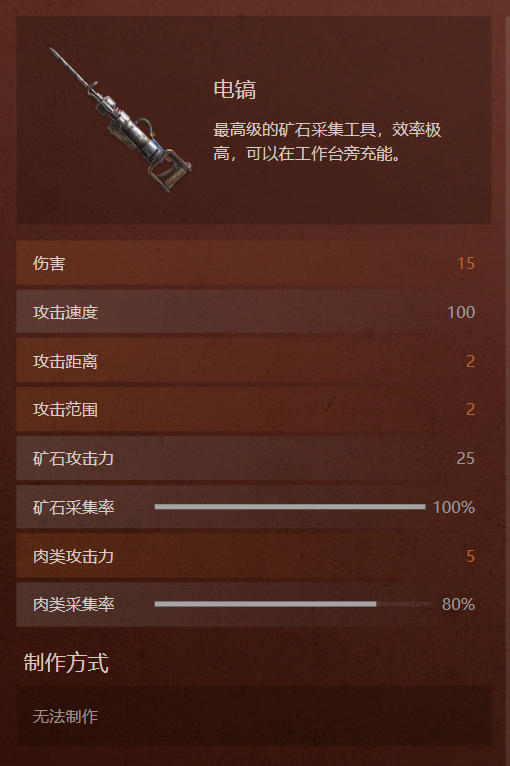 另外电镐不需要充能可以直接用,但是不能学习,在工作台附近它会自动修复所以不用担心损耗。