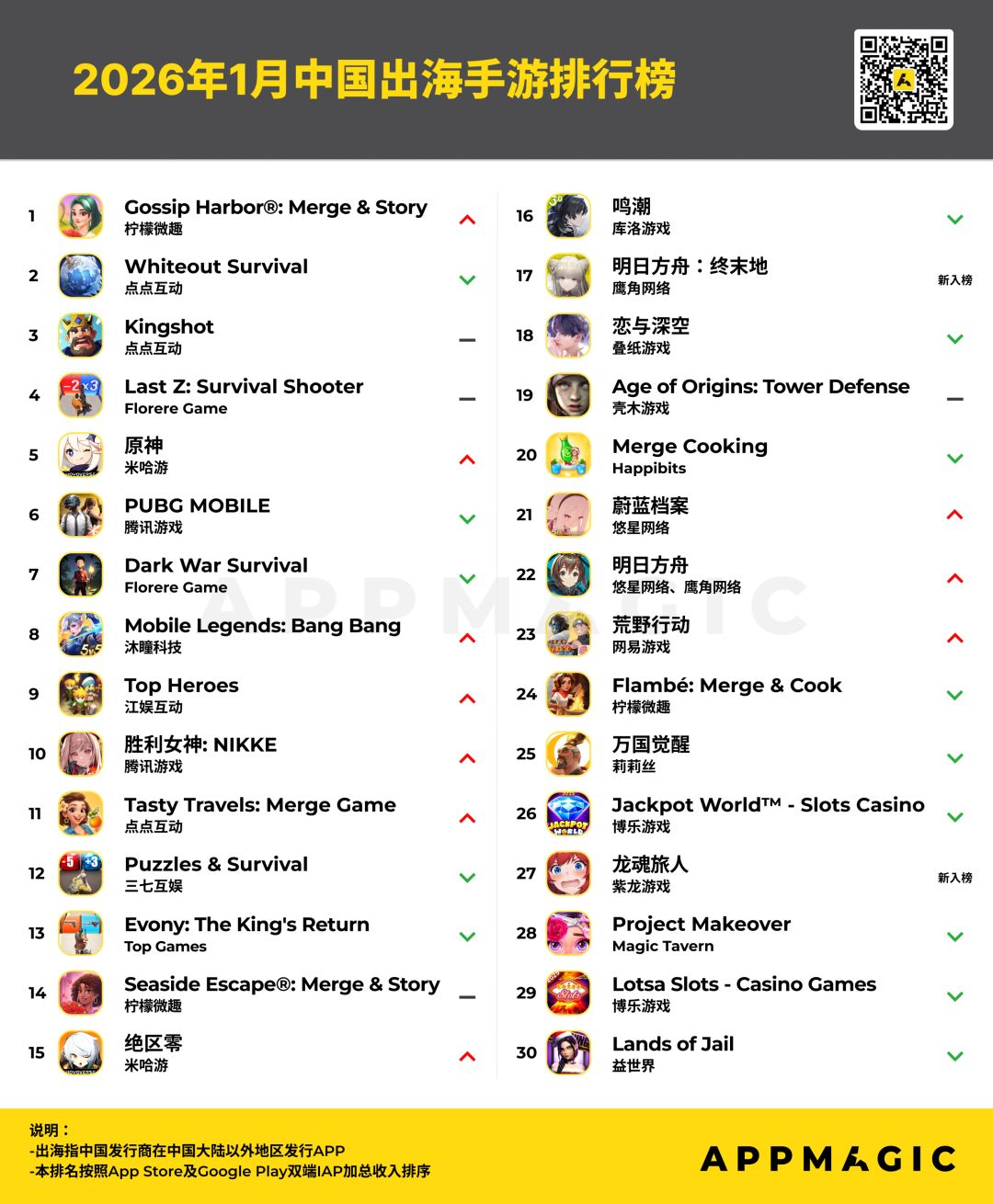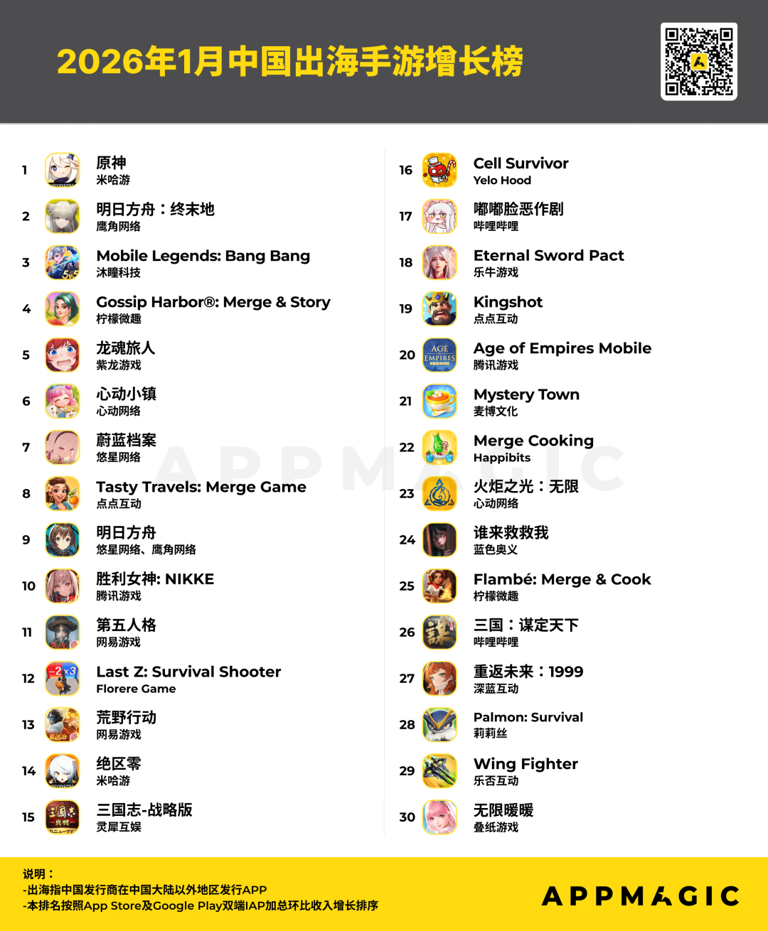 2月5日,AppMagic发布2026年1月中国出海手游排行与增长榜。