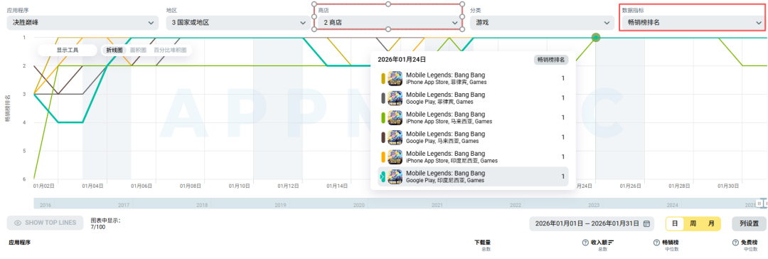 排名表现看,印尼、马来西亚及菲律宾三大东南亚市场在1月后半月连续6天登顶双端畅销榜,显示出强劲的本地用户付费活跃度。与此同时,M7世界总决赛于1月举行并连续刷新全球移动电竞收视纪录,赛事热度有效放大品牌影响力与用户参与度,带动区域收入增长。