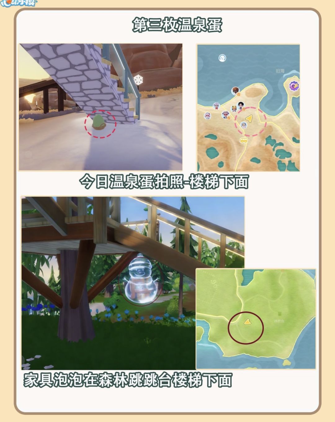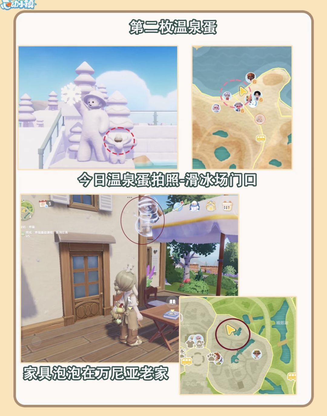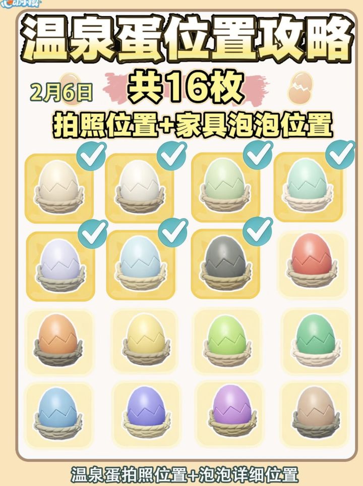 小镇的各位收藏家请注意,2月6日温泉蛋打卡点已刷新!今日坐标锁定在文艺街,具体就藏在「收藏家对面」那个容易路过的角落。如果看到地上隐隐闪着微光的蛋形轮廓,别犹豫,掏出相机“咔嚓”一下,今天的家具奖励泡泡就会蹦到你面前!