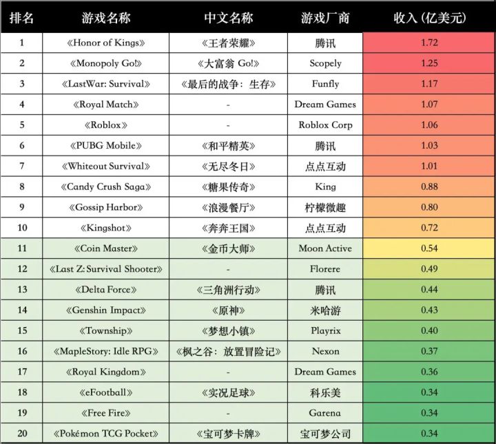 国际赛场竞争激烈,Scopely《Monopoly Go》以1.25亿美元位居第二,FunFly《Last War》和Dream Games《Royal Match》分别以1.17亿、1.07亿美元紧随其后。