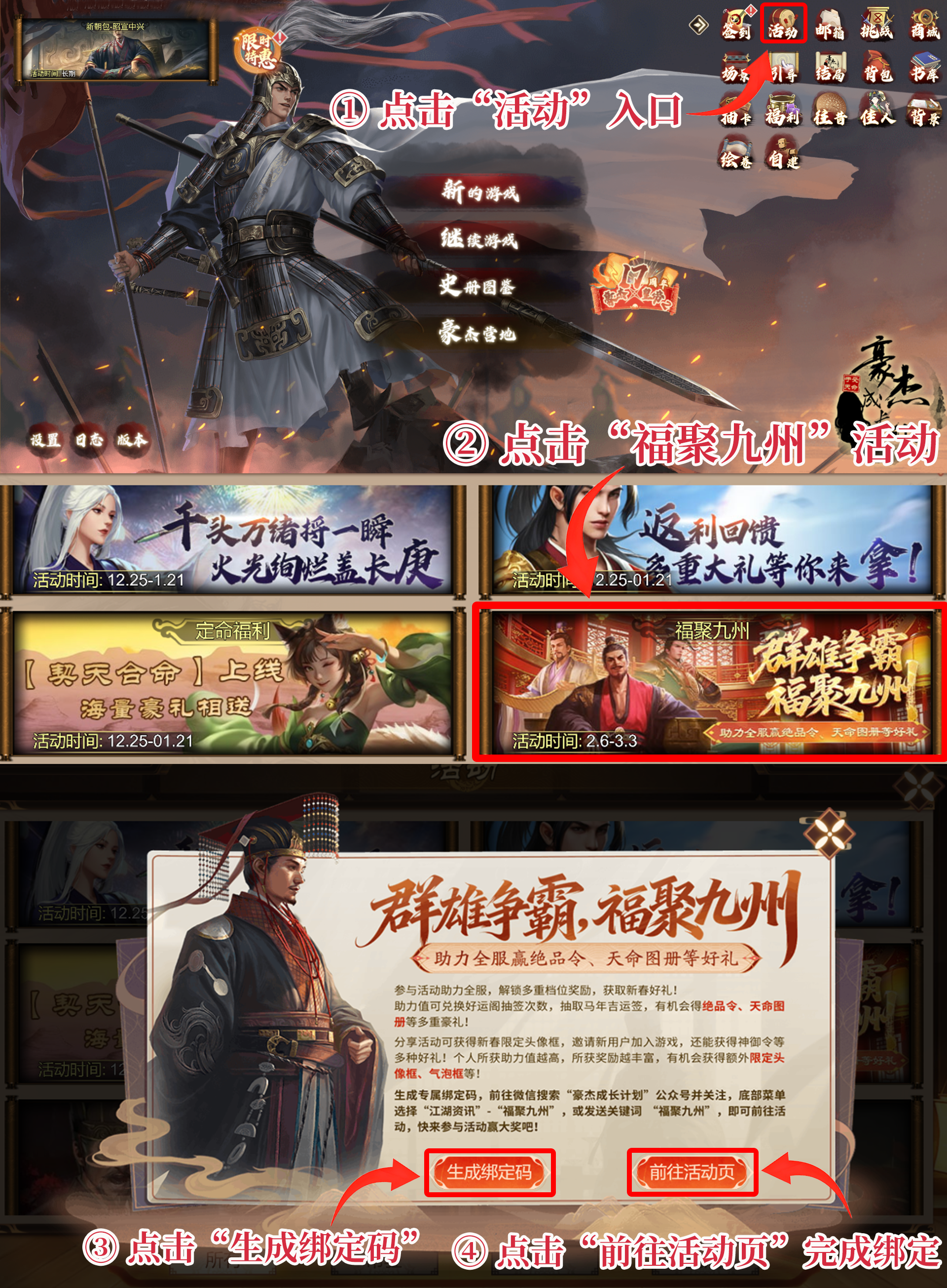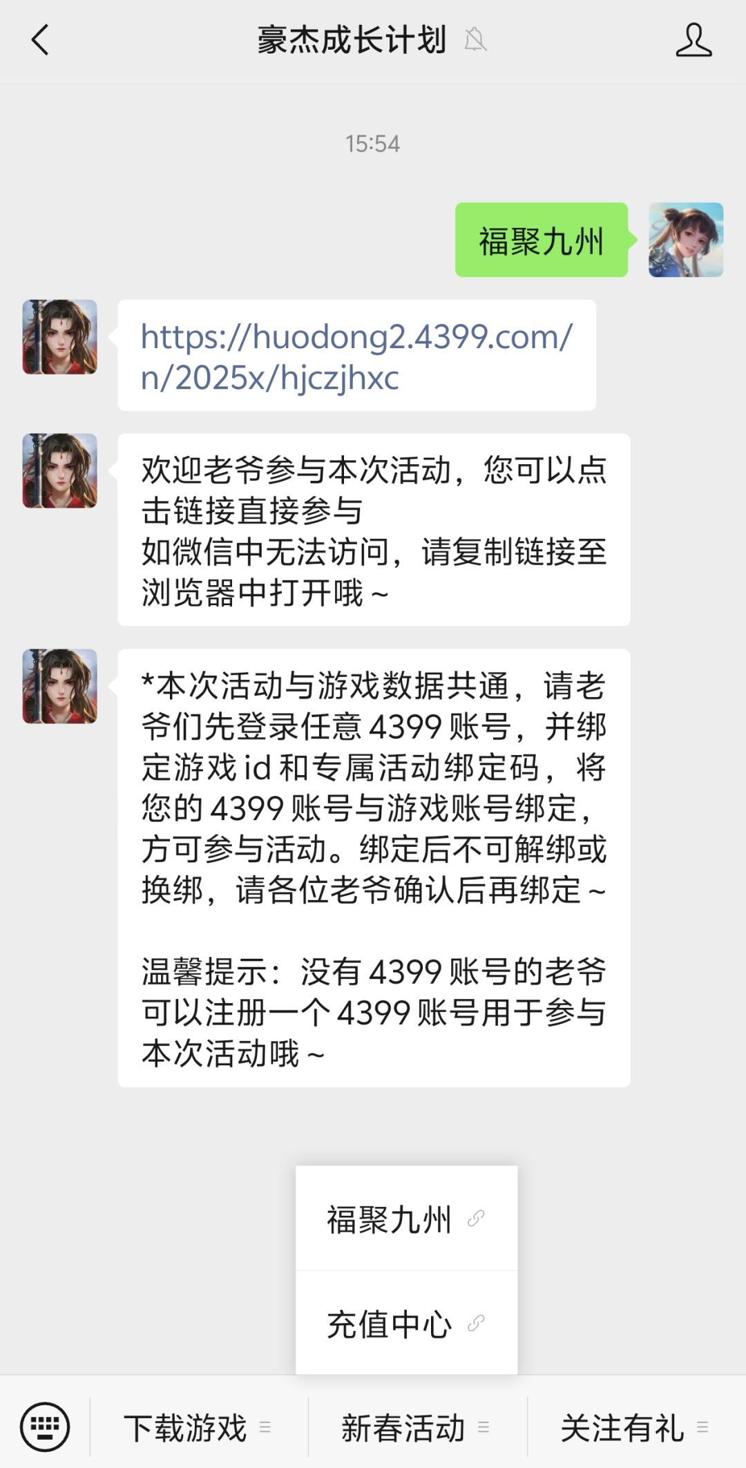 前往公众号参与,微信搜索“豪杰成长计划”公众号并关注,底部菜单选择“新春活动”-“福聚九州”,或发送关键字“福聚九州”,即可参与活动